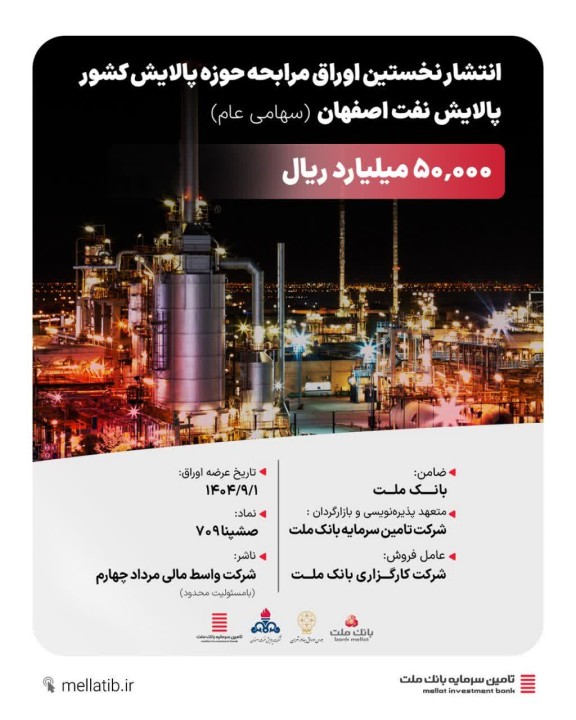 درراستای توسعه پروژههای زیرساختی و زیستمحیطی کشور، بانک ملت به عنوان ضامن و شرکت تأمین سرمایه بانک ملت بهعنوان مشاور عرضه، متعهد پذیرهنویس و بازارگردان، فرآیند انتشار اوراق مرابحه 50 هزار میلیارد ریالی شرکت پالایش نفت اصفهان با نرخ 23 درصد، سررسید سهساله و بازپرداخت هر سه ماه یکبار را آغاز کرد.