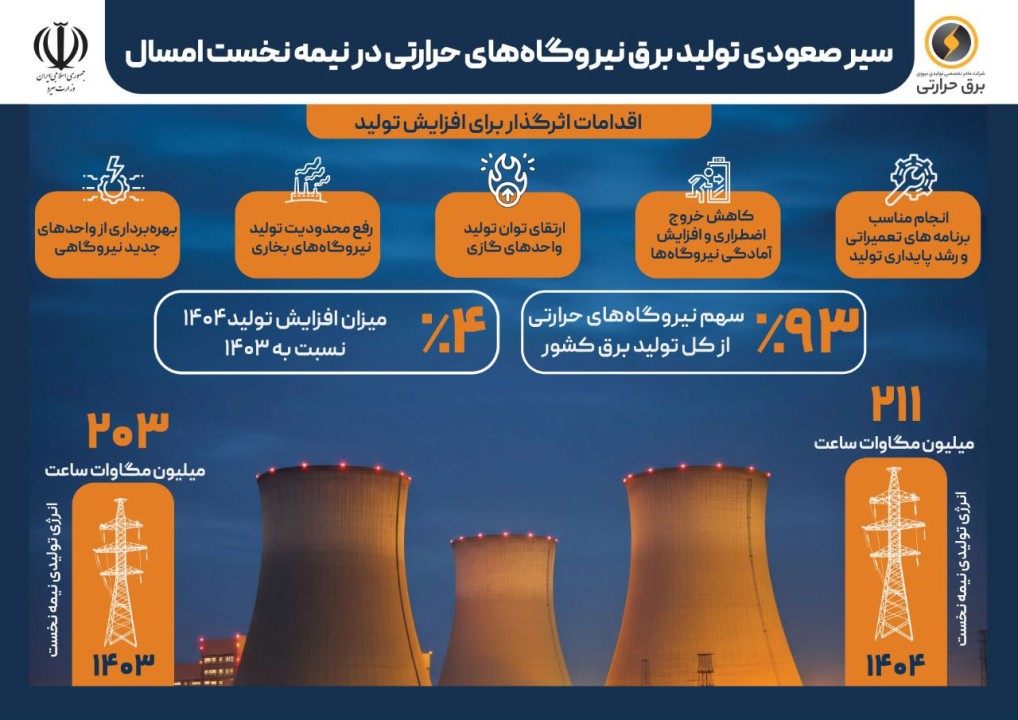 در نیمه نخست سال 1404، سهم نیروگاههای حرارتی از کل تولید برق کشور به 93 درصد رسید و این نیروگاهها موفق به تولید 211 میلیون مگاوات ساعت انرژی شدند.