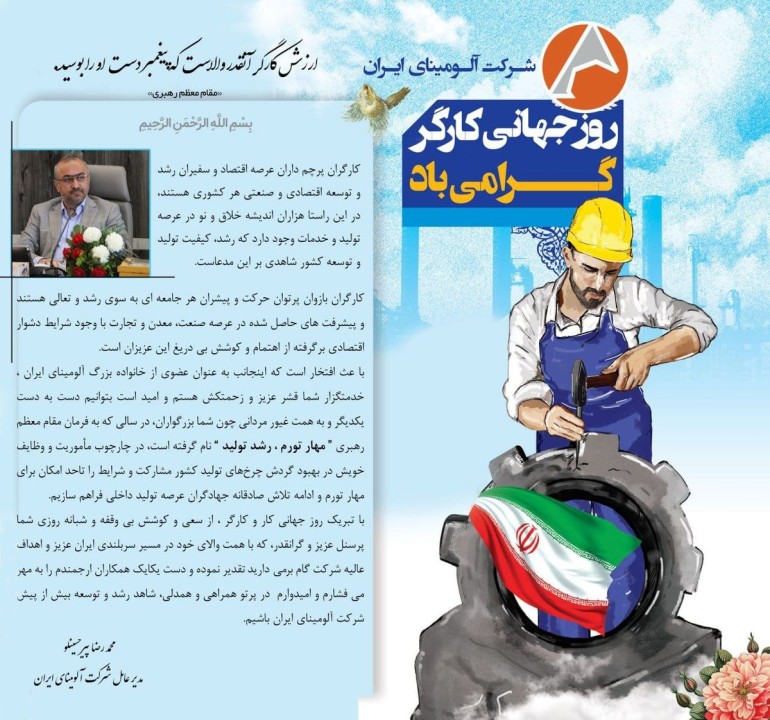 پیام تبریک مهندس پیرحسینلو مدیر عامل محترم شرکت آلومینای ایران به مناسبت روز جهانی کار و کارگر