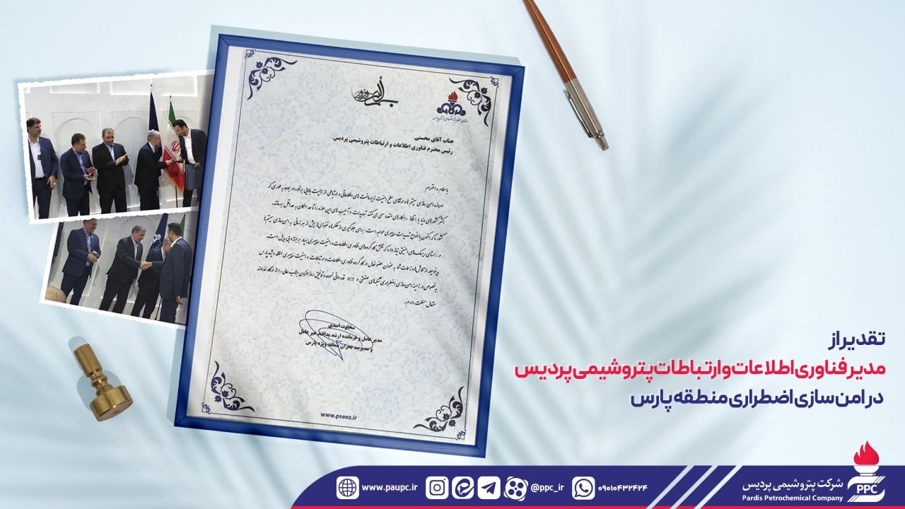 همچنین، از تلاشهای مداوم و مؤثر آقای محسنی مدیر فناوری اطلاعات و ارتباطات پتروشیمی پردیس و عضو کارگروه فناوری اطلاعات و ارتباطات و امنیت سایبری منطقه پارس در توسعه زیرساختهای ICT و ایجاد شبکه های امن و پایدار در منطقه ویژه اقتصادی انرژی پارس قدردانی به عمل آمد.
