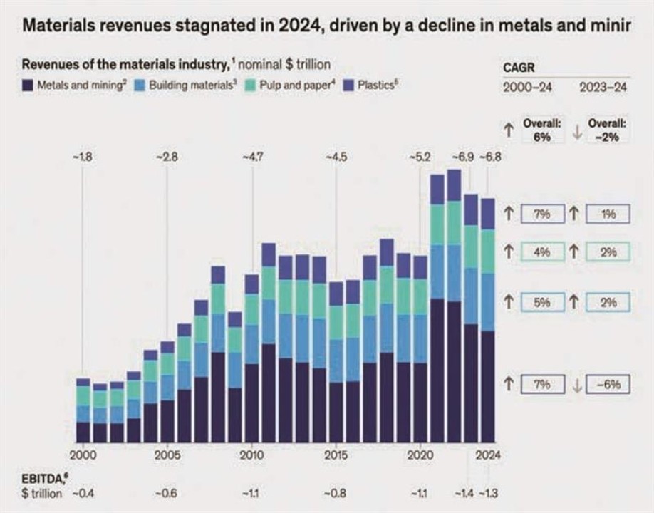 این آزمون بیش از هر چیز در صورتهای مالی شرکتها نمایان شد. همانطور که در شکل شماره 1 نشان داده شده است، درآمدهای کلی صنعت مواد در سال 2024 دچار رکود شد و 2 درصد نسبت به سال قبل با یک افت پیدا کرد. دادههای مکنزی بهوضوح نشان میدهد این افت تقریباً بهطور کامل ناشی از بخش «فلزات و معدن» بود که بهتنهایی با یک انقباض 6 درصدی در درآمد روبهرو شد، درحالیکه سایر بخشها مانند مصالح ساختمانی، رشد اندکی را تجربه کردند. بااینحال، سودآوری به طرز قابلتوجهی تابآور باقی ماند که نشاندهنده انضباط هزینهای و قدرت قیمتگذاری در این بخش است.