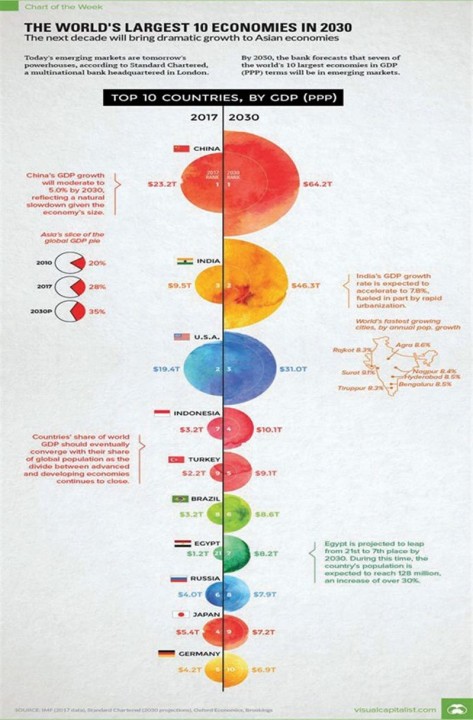 دادهها نشان میدهد که بازارهای نوظهور نهتنها در حال صعود، بلکه در حال تسلط هستند. پیشبینی میشود چین جایگاه خود را بهعنوان رتبه اول تثبیت کند و تولید ناخالص داخلی آن به 64.2 تریلیون دلار افزایش یابد. بااینحال، چشمگیرترین جهش متعلق به هند است که پیشبینی میشود از ایالاتمتحده عبور کند و با رشدی خیرهکننده، به دومین اقتصاد بزرگ جهان با 46.3 تریلیون دلار تبدیل شود.