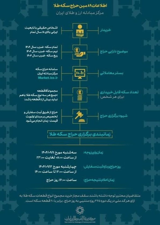در این مرحله از حراج، انواع سکه های بانک مرکزی ضرب 1404 عرضه خواهد شد و متقاضیان می توانند از طریق سامانه معاملات سکه به نشانی market.ice.ir ثبت سفارش انجام دهند.