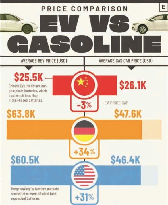 تصویر روبهرو، این شکاف عظیم میان چین و غرب را به تصویر میکشد. درحالیکه در چین (دایره قرمز)، خودروهای برقی بهطور متوسط 25.5 هزار دلار قیمت دارند (ارزانتر از 26.1 هزار دلار بنزینی)، در آلمان و آمریکا، خودروهای برقی همچنان بیش از 30 درصد گرانتر از همتایان فسیلی خود هستند. این تصویر بهوضوح نشان میدهد که «پریمیوم سبز» در چین به «تخفیف سبز» تبدیل شده است.