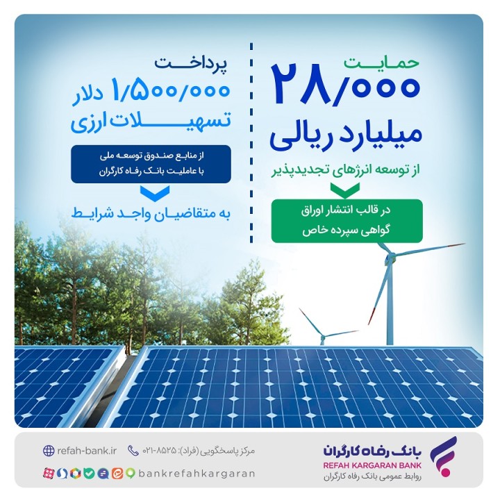 بانک در این سال به منظور حمایت از توسعه انرژیهای پاک حدود 28.000 میلیارد ریال تسهیلات ریالی به شرکتهای فعال در این حوزه پرداخت کرده است.